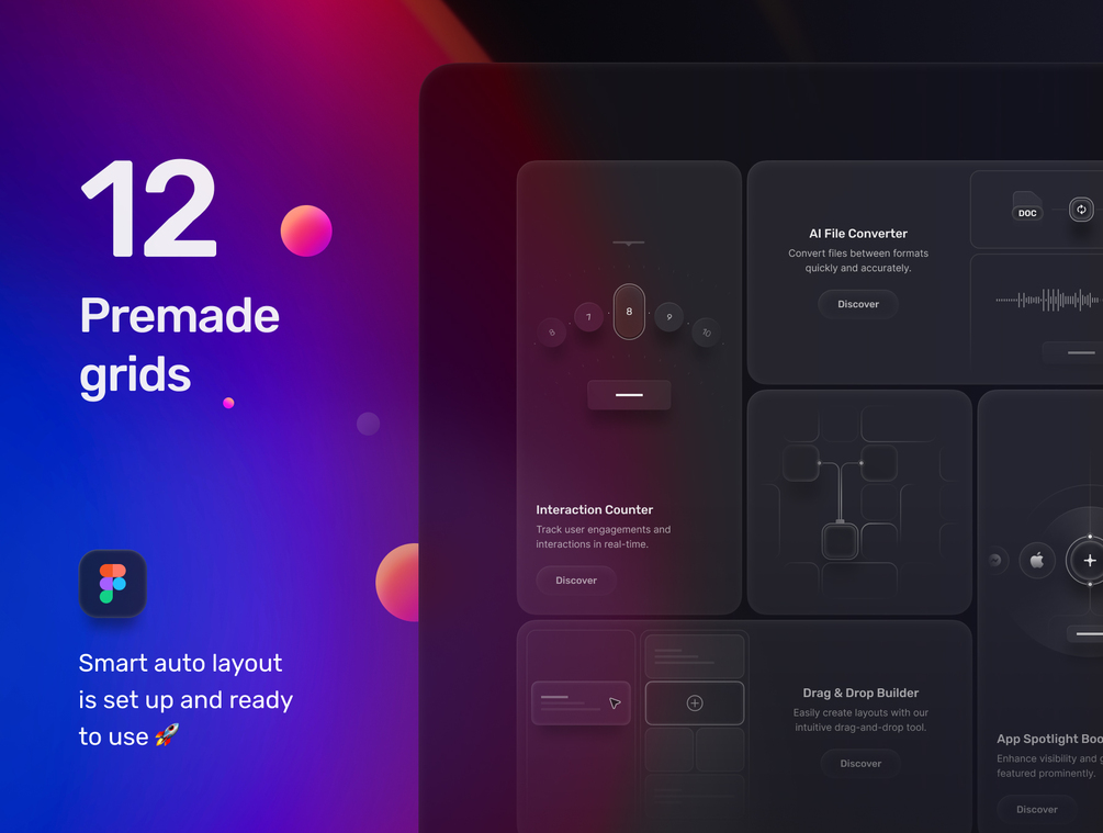 You can easily swap out illustrations within each card, switch the card layout from horizontal to vertical view with a single click, and move text positions effortlessly. Additionally, the system includes an on-off button for added convenience. All features are under your control, enhanced further by 12 pre-made grids to save you time.