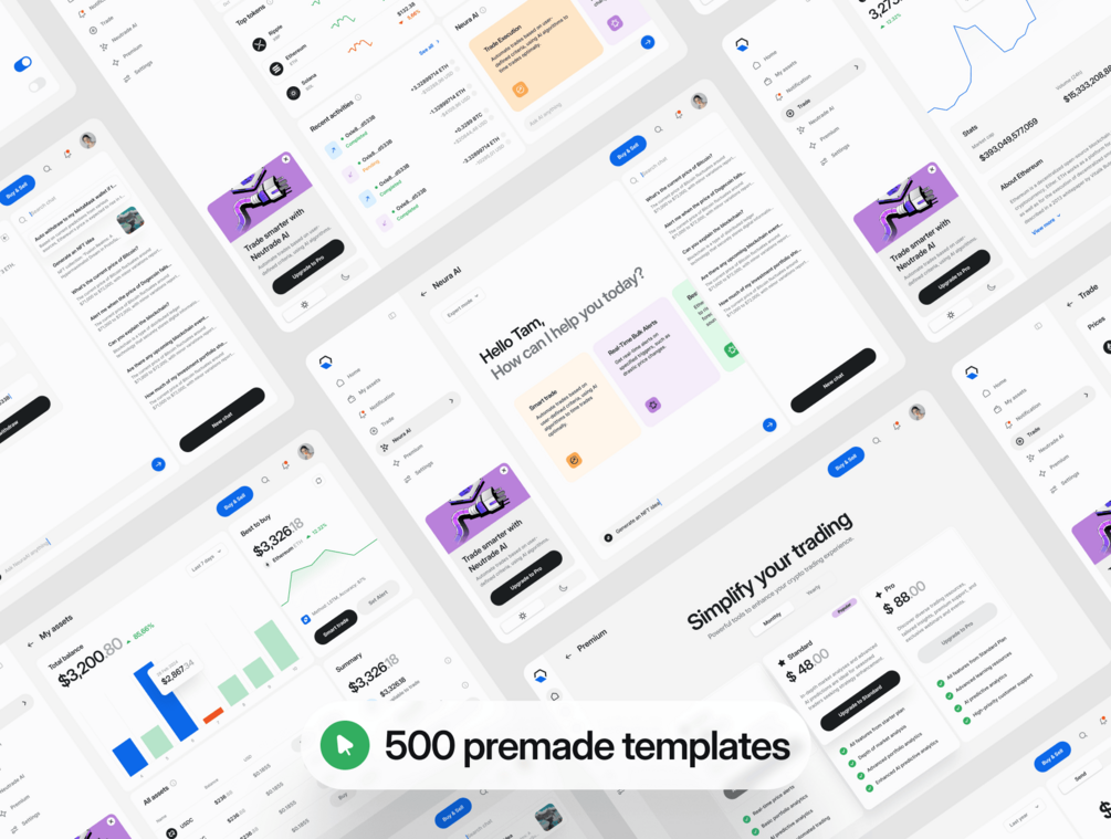 Boost your design process with Neutrade's 200 components, making it easy to create cutting-edge cryptocurrency apps. This kit provides 500 polished, minimalist screens designed with Figma Autolayout and Figma variables, all utilizing free Google fonts for better compatibility and customization. Drag, drop, and mix elements to quickly craft your personalized Crypto AI dashboard.