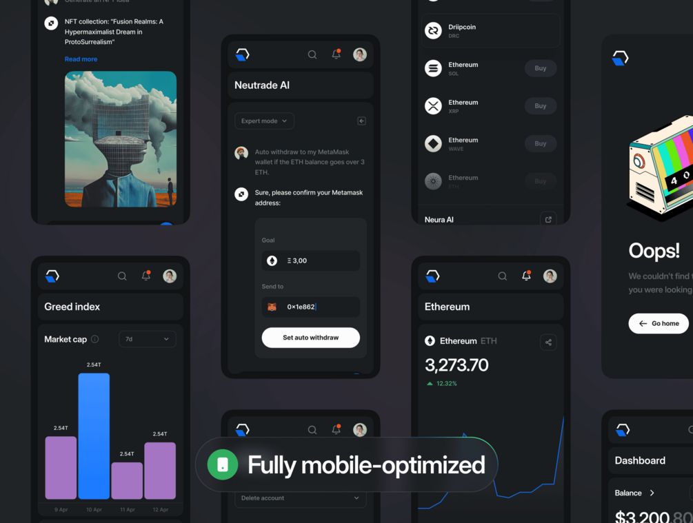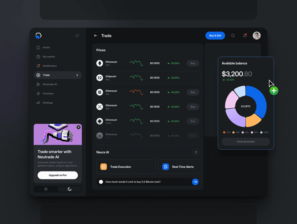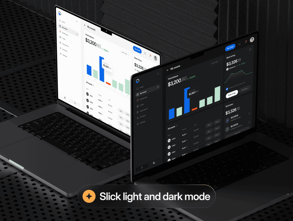 Neutrade is a clean and minimal Crypto AI UI Kit built for all your design needs across desktop, tablet, and mobile. It's available in both eye-catching light and dark modes, enabling broad aesthetic appeal.